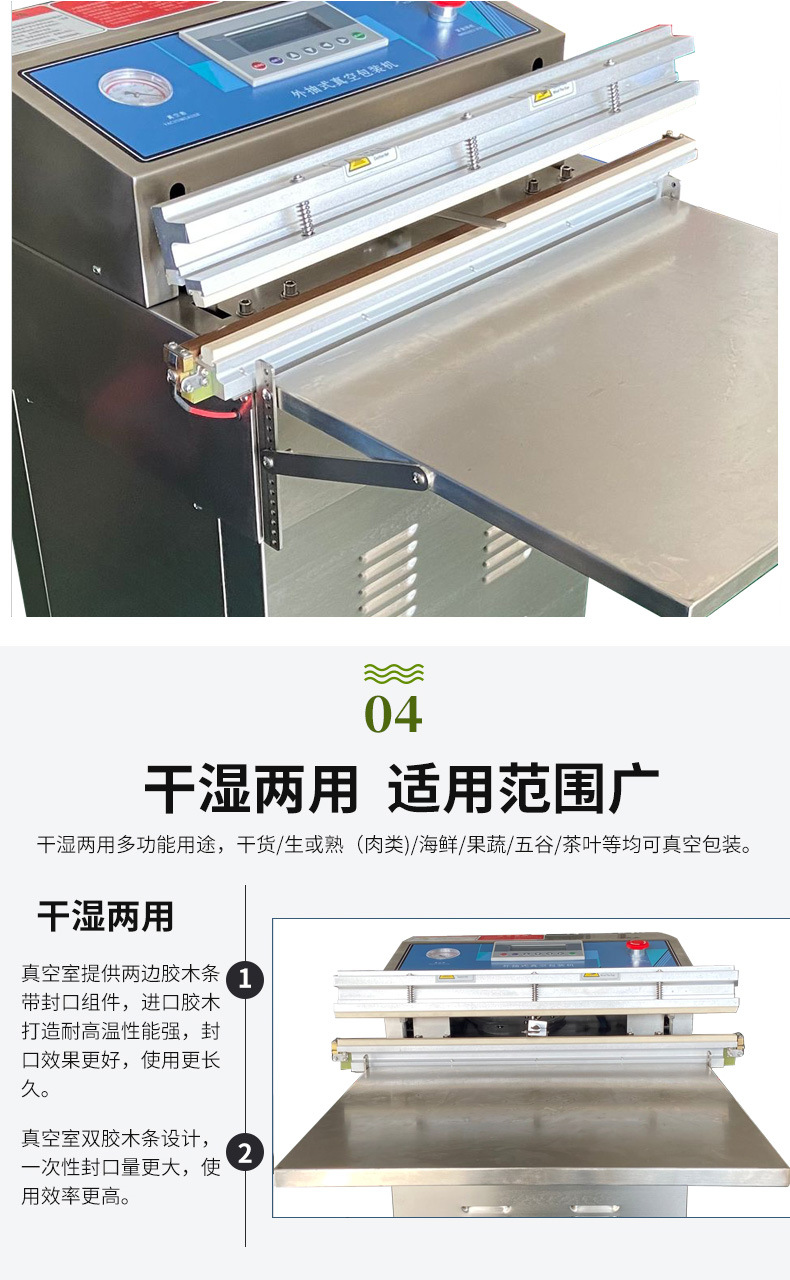 • 靈活性高:外抽真空包裝機不受包裝容器形狀和尺寸的限制。無論是大型的工業用真空袋,還是小型的家用真空袋,只要抽氣口能夠與抽氣嘴連接,就可以進行真空包裝。例如,在包裝大型的工業零部件或不規則形狀的工藝品時,外抽式的特點使得它能夠輕松應對,而內抽式真空包裝機可能會因為真空室尺寸的限制而無法完成包裝。