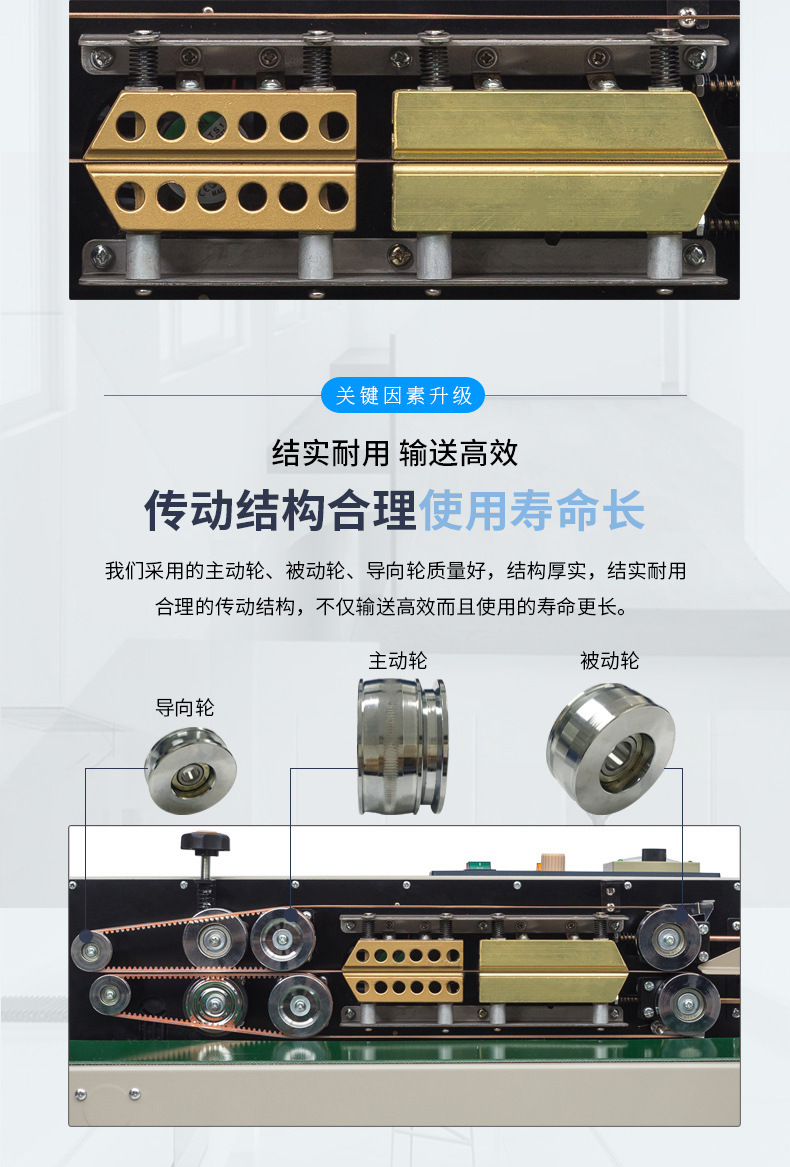 - 輸送原理:其輸送系統是保證連續封口的關鍵。一般由電機、傳動帶(或傳動鏈)和滾輪等組成。電機提供動力,通過傳動裝置帶動滾輪或傳送帶運動。包裝材料放置在傳送帶上或者由滾輪帶動,以一定的速度連續地向封口位置移動。輸送速度是可以調節的,這取決于包裝材料的類型、厚度以及封口的要求等因素。例如,較厚的包裝材料可能需要較慢的輸送速度,以確保封口處有足夠的時間來完成熱封過程。
