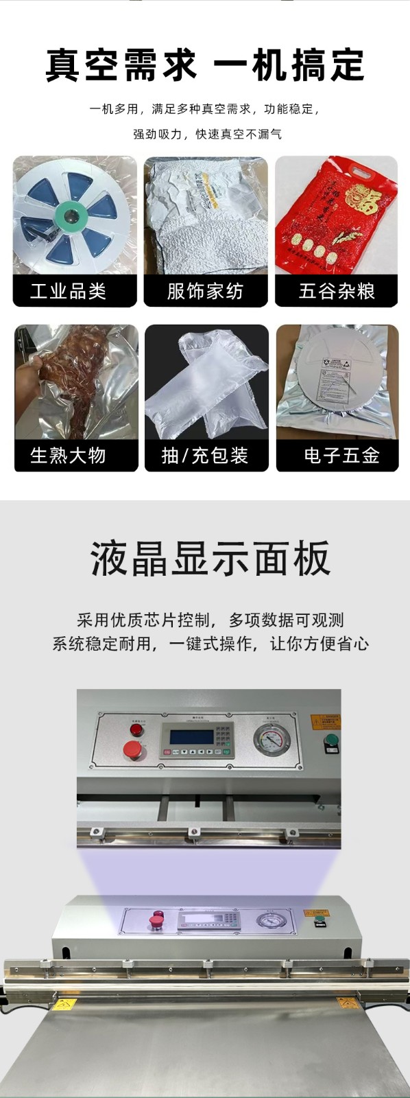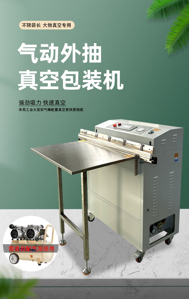 - 外抽式:一般采用立式結構,無密封真空室,由工作臺、抽氣裝置、封口裝置和控制系統等組成,結構較為簡單,占地面積小。