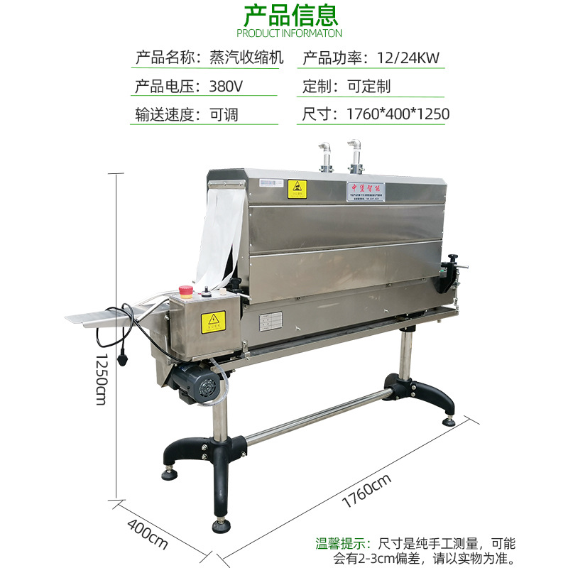- 薄膜材質(zhì):不同的熱收縮薄膜材質(zhì)(如 PVC、PE、PP 等)在收縮性能、透明度、柔韌性等方面存在差異,要根據(jù)產(chǎn)品的包裝要求和使用環(huán)境等因素選擇合適的薄膜材質(zhì),同時也要確保所選的蒸汽收縮機能夠適應(yīng)這種薄膜材質(zhì)的收縮特性。