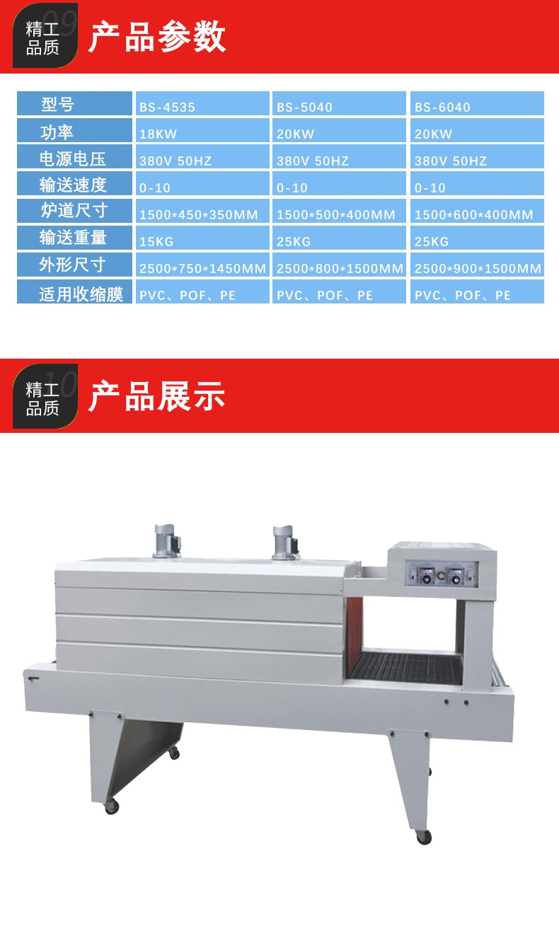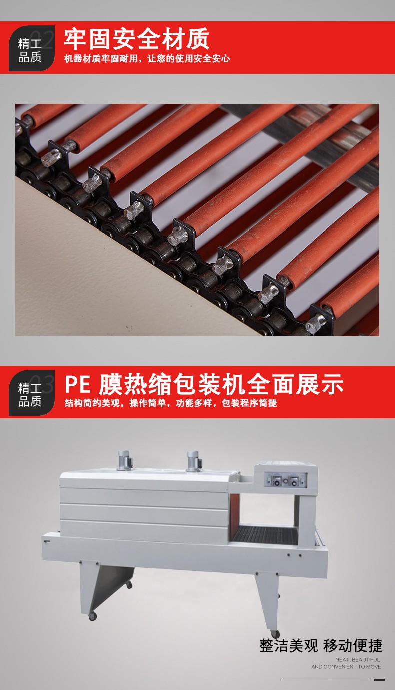 包裝質(zhì)量高:PE 熱收縮包裝機能夠使 PE 薄膜緊密地貼合產(chǎn)品,包裝后的產(chǎn)品外觀整潔、美觀,沒有褶皺。由于 PE 薄膜本身具有良好的柔韌性和透明度,包裝后的產(chǎn)品可以清晰地展示其形狀和外觀,同時也能有效地防止灰塵、水分等進入產(chǎn)品,起到很好的保護作用。