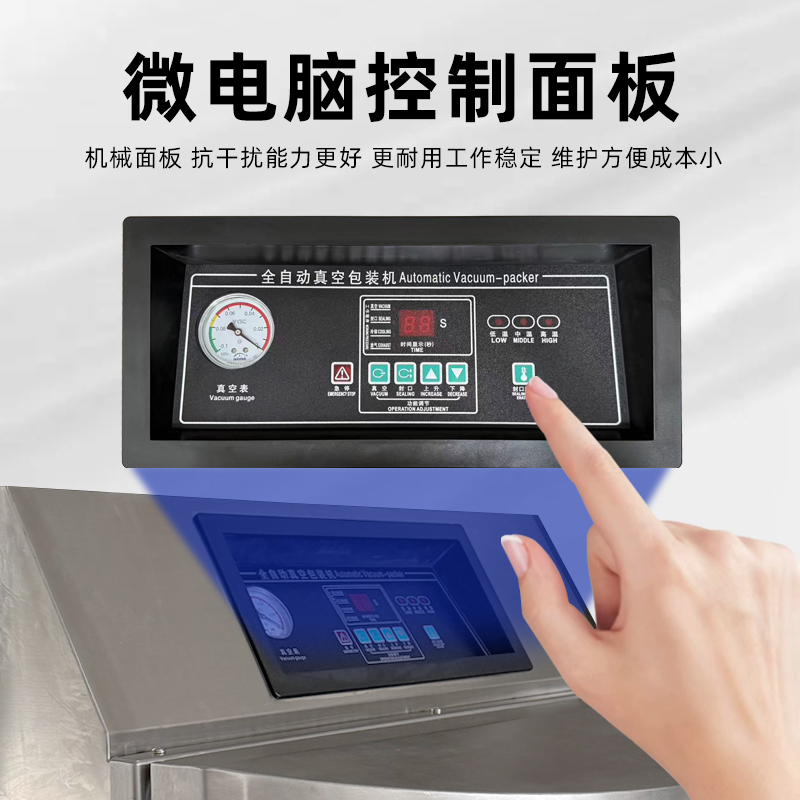 真空室:通常采用較大的腔體設計,多為豎立式,可容納大尺寸的包裝物品或多個小包裝同時進行包裝,部分還可將產品外包裝桶、紙箱等一起放入進行包裝。 封口裝置:一般為豎立式氣動封口,通過氣缸控制封口條,使包裝封口受力均勻,封口平直、美觀不起皺,封口尺寸多樣,常見的有 600mm、800mm 等。 控制系統:多采用 PLC 觸屏控制,可精確控制真空、加熱、冷卻時間,還能通過電接點真空表直接控制真空度,操作方便,穩定性強。 抽氣系統:配備高性能的真空泵,抽氣速度快,真空度高,部分機型還帶有過濾裝置,可防止粉末等雜質進