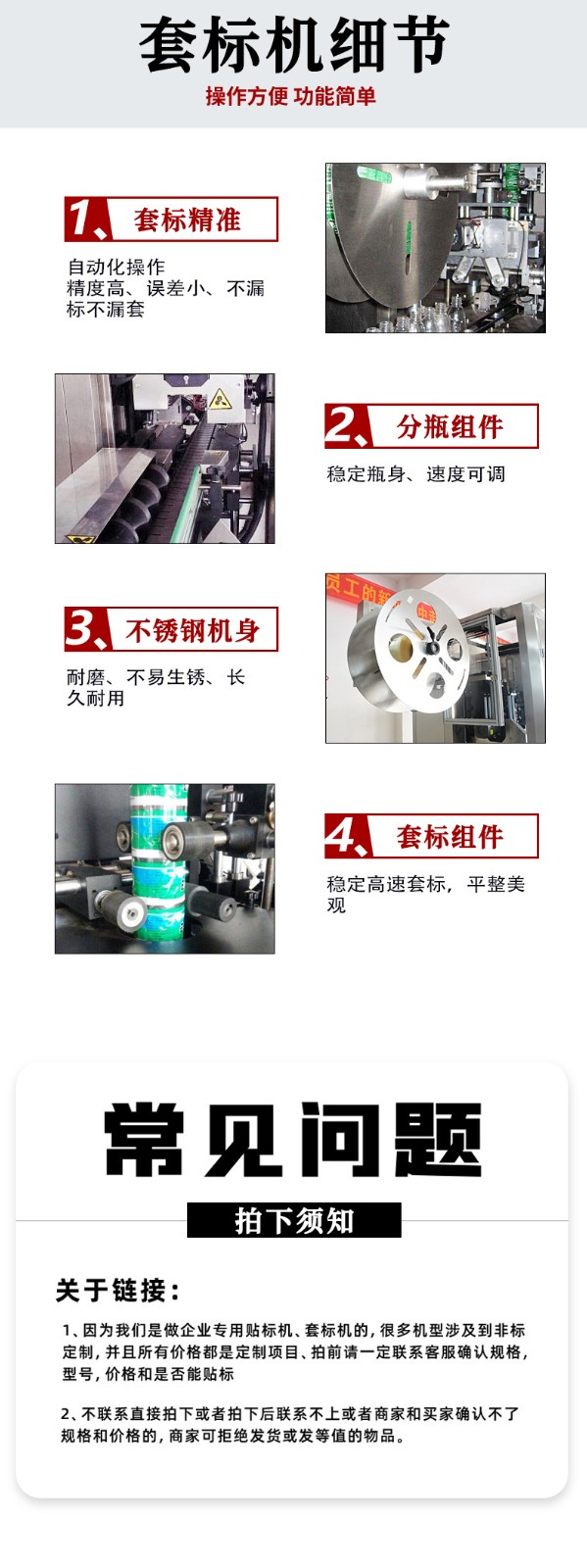- 撥輪機構通過伺服電機驅動,將容器調(diào)整為等間距(誤差≤1mm)、同方向排列,確保每個容器的套標位置(如瓶頸、瓶身中部)與標簽開口完全對應。