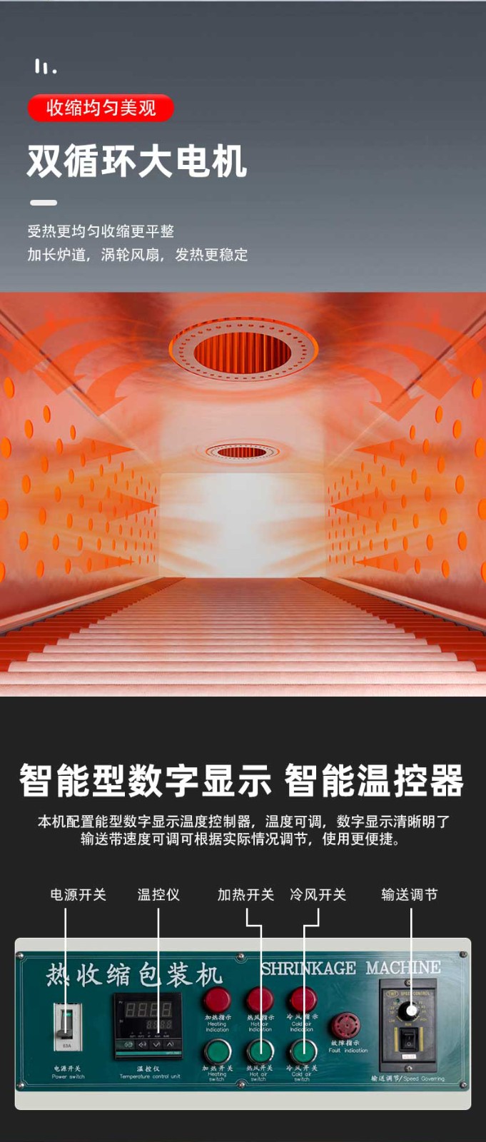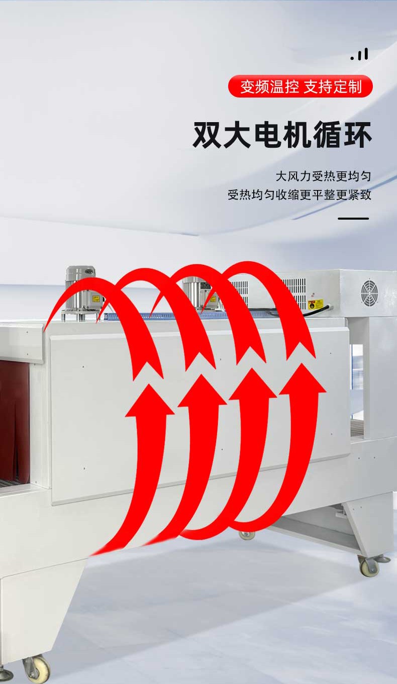 • 熱收縮定型:封切后的產品進入熱收縮區,這里有高溫熱風循環系統,使膜材均勻收縮,緊密貼合產品輪廓。比如有的設備采用螺旋風道設計,能有效提升收縮效率。