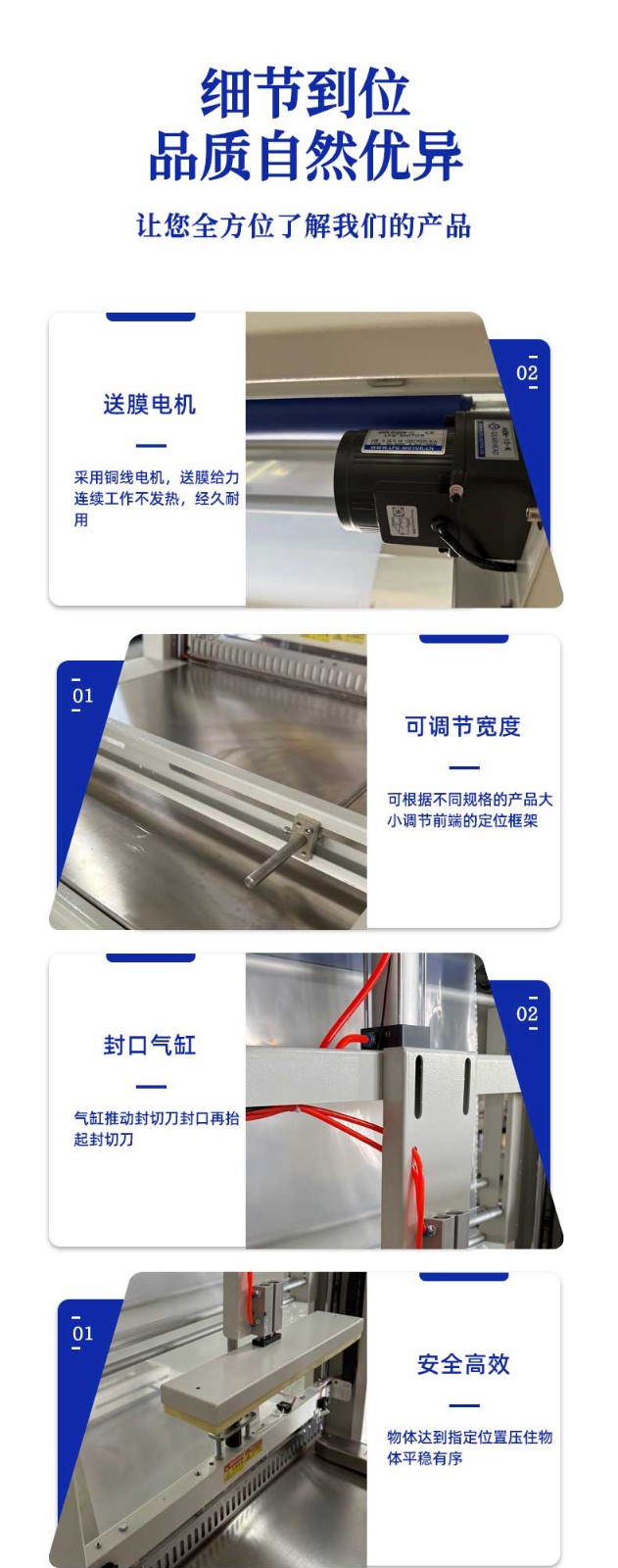 • 包裝效果好:通過精確的送膜和封切控制,以及均勻的熱收縮過程,包裝膜可以緊密貼合產品,形成美觀、牢固的袖口式包裝,提升產品的外觀品質和市場競爭力6