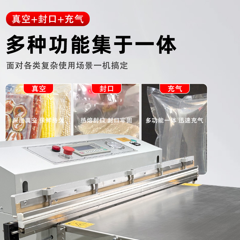 • 適配多場景:支持 PE、PA、鋁箔等多種包裝材料,可切換 “真空封口”“充氣保鮮” 兩種模式,兼顧工業防銹與食品保鮮需求。