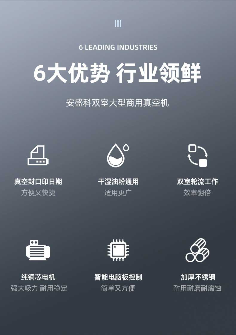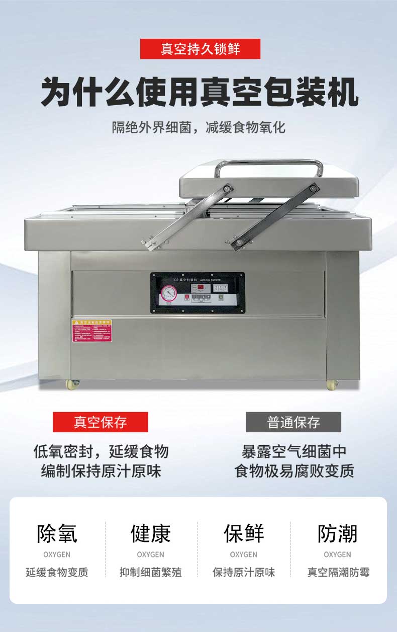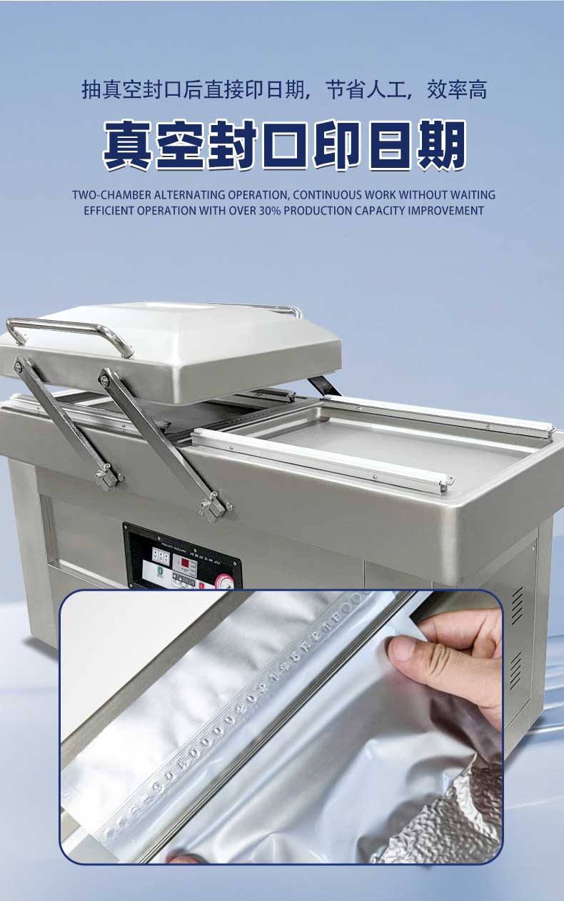 雙室凹槽真空包裝機是一種高效的真空包裝設備,廣泛應用于食品、電子等行業。雙室凹槽真空包裝機通過抽氣泵將袋子內的空氣抽走,形成真空狀態,然后通過熱封機將袋子密封。其主要由真空泵、真空室、熱封機和電控系統組成。具體工作步驟為:將食品放入袋子并置于真空室后,按下啟動按鈕,真空泵抽取袋子內空氣,達到設定真空度后,熱封機進行封口操作,封口完成后設備自動停止。