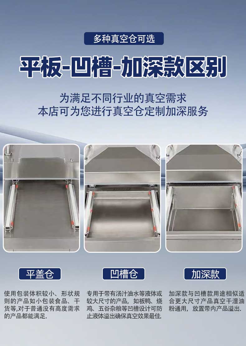 • 適應帶湯汁或液體產品:下凹式設計能讓產品在包裝過程中處于傾斜狀態,有效防止湯汁或液體在抽真空時溢出,確保封口質量。