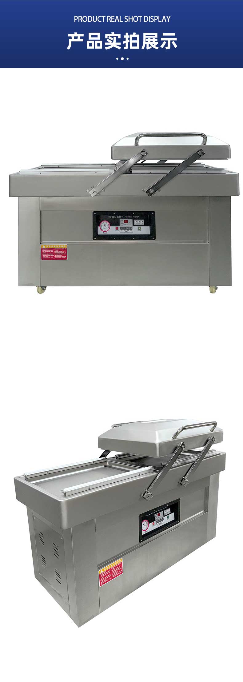 • 雙室設計:一個真空室在抽真空時,另一個真空室可以擺放包裝物,交替工作,節省操作時間,提高包裝效率。