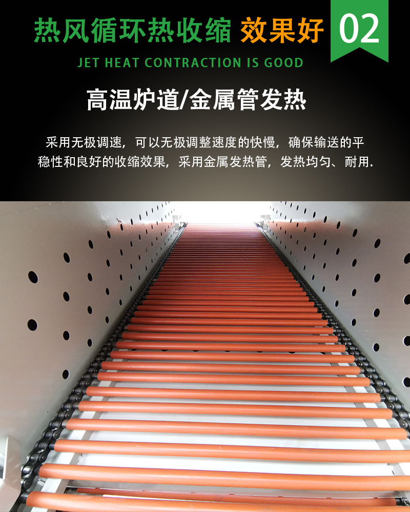 熱收縮機它是一種用于物品包裝的設備,通過加熱和收縮包裝帶,將產品緊密包裹起來,達到保護產品、延長產品壽命、促進銷售的目的。是一款功能強大、實用性廣泛的設備,在現代生產生活中扮演著重要的角色。相信隨著科技的不斷發展,熱收縮機將會變得更加智能化、高效化,為我們的生活帶來更多的便利和驚喜,利用高溫熱源將物品進行自動收縮包裝的設備。廣泛的應用于食品、醫藥、化妝品、電子產品等多個行業。使得包裝物品更加美觀、密封、防潮、防腐。