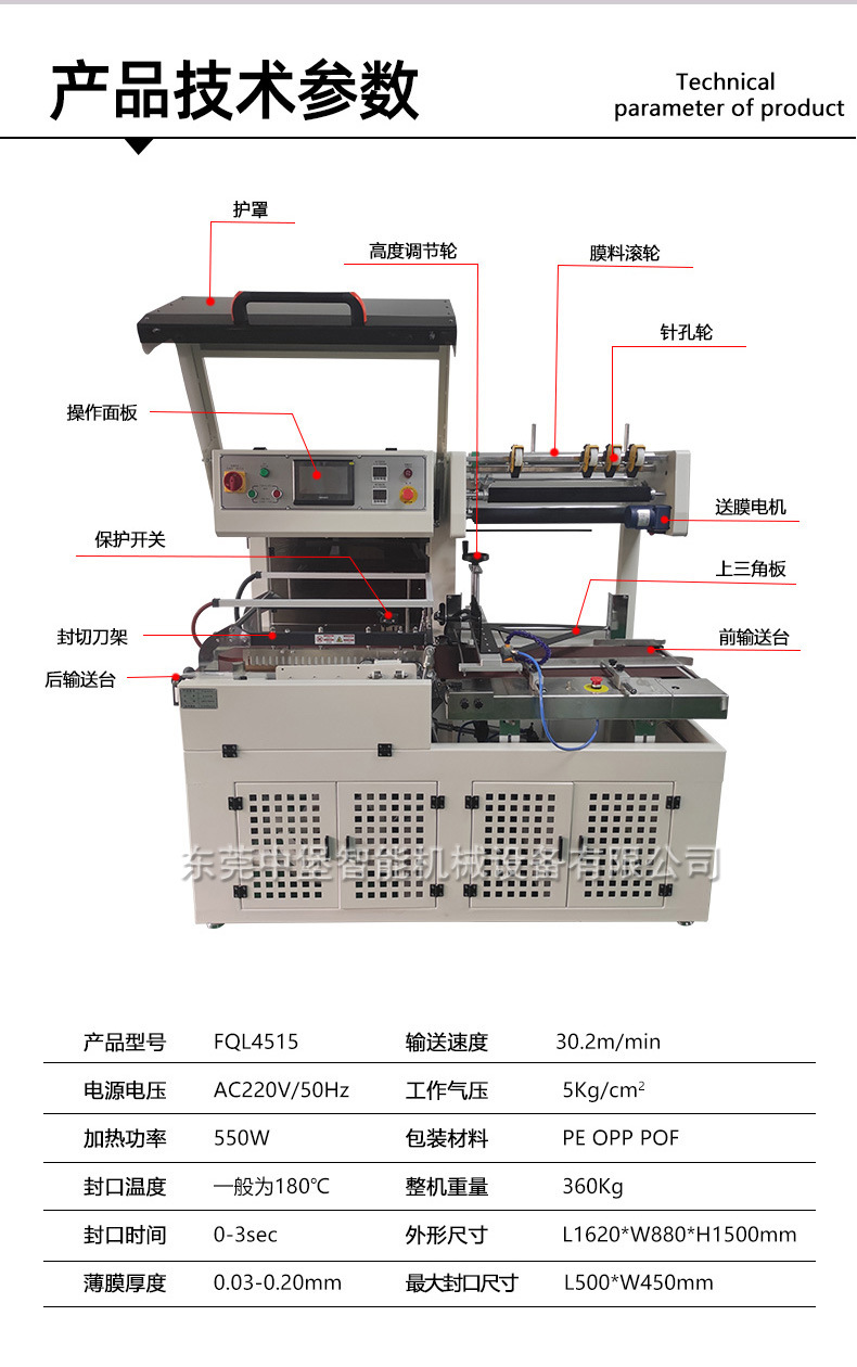全自動無人化操作的“L”型封切機,廣泛用于批量生產包裝的流水作業,工作效率高,自動送膜打孔裝置,手動調節的導膜系統,及手動調節的進料輸送平臺。適用不同寬度及高度的產品,本機型還可設計密接功能,專為包裝小產品設計, 特點說明 封刀采用杜邦特弗龍涂層抗粘耐高溫合金刀,封口不會開裂,不會焦化、不冒煙無污染;配有進口邦納檢測光電,水平、垂直檢測各一組,便于切換選擇,對于薄與小的包裝物,可輕易完成封口包裝作業; 自動送料,長度亦能經由電眼和計時器的組合,自動調節。配有感應馬達,自動卷取廢料;當包裝物尺寸變更時,調整