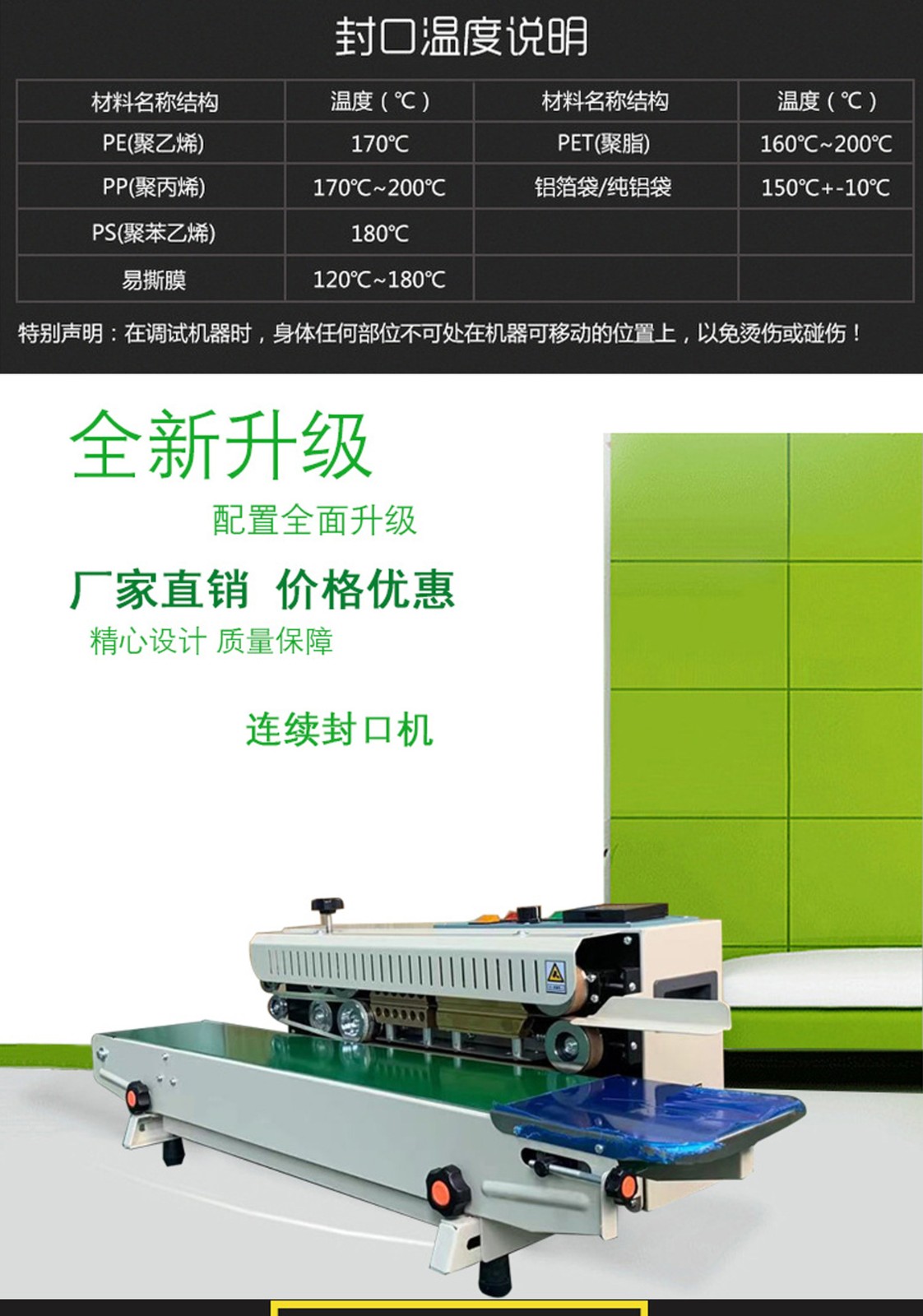 盡管連續式封口機具有諸多優勢,但在實際應用中仍需要注意一些問題。例如,在使用連續式封口機時,需要根據產品的特性和封口要求選擇合適的封口材料和參數,以確保封口質量和產品安全。此外,連續式封口機的維護和保養也至關重要,定期檢查和更換易損件、保持設備的清潔和潤滑等,都是確保設備正常運行和延長使用壽命的關鍵。