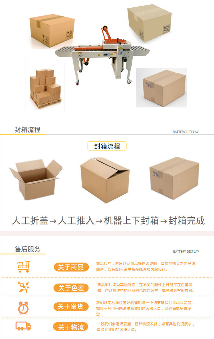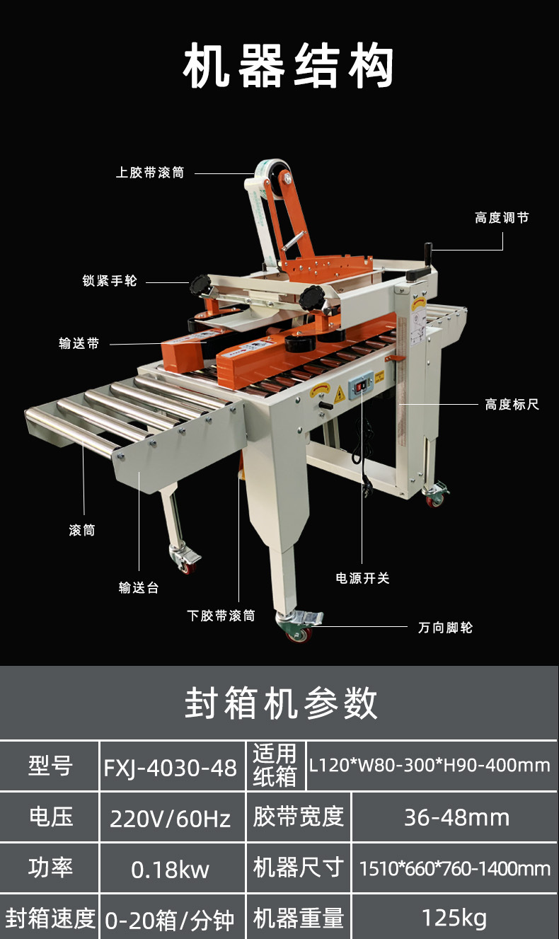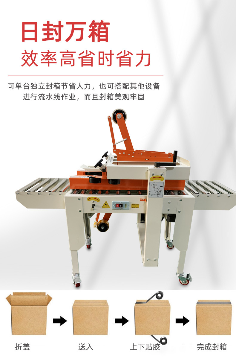 封箱機是一種用于紙箱封箱包裝的設(shè)備,主要適用于紙箱的封箱包裝,既可單機作業(yè),也可與流水線配套使用。它可單箱作業(yè),也可與紙箱成型開箱機、裝箱機、貼標機、捆包機、棧板堆疊機、輸送機等設(shè)備配套成包裝流水線使用,為包裝流水線作業(yè)必須的設(shè)備。封箱機的主要分類包括自動拆蓋封箱機系列、氣動調(diào)整封箱機系列、自動封箱機系列、邊角式封箱機系列、四角邊封箱機、工字型封箱等,封箱方式可分為上下驅(qū)動、左右驅(qū)動、側(cè)邊、角邊等,一般采用透明膠帶以及牛皮紙材料。