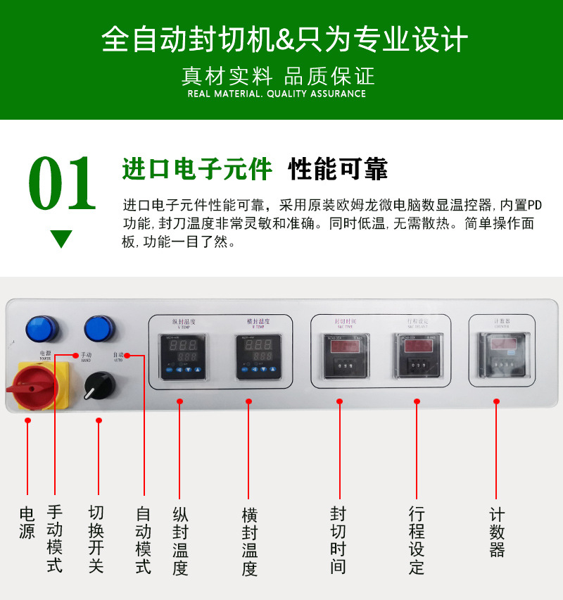 封切機是全自動無人化操作的包裝機,廣泛用于批量生產包裝的流水作業,工作效率高,自動送膜打孔,自動套膜封切,自動卷取廢料;只需手動調節導膜系統以及手動調節進料輸送平臺,適用不同寬度及高度的產品。