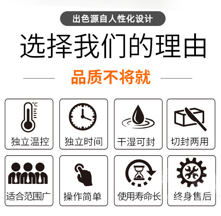 4. 操作簡便:?操作簡單,?加熱時間可調,?接通電源即可工作,?適用于各種塑料薄膜封口。?