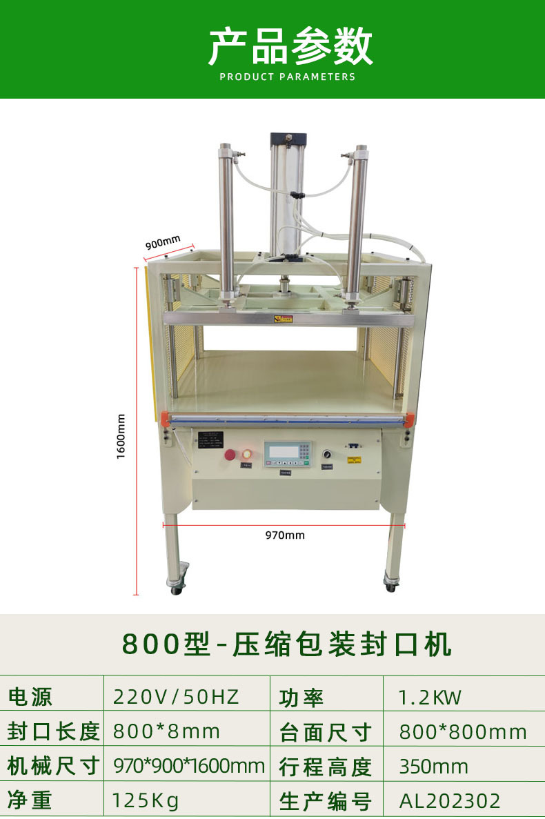 壓縮包裝封口機適用于壓縮包裝羽絨被服、太空棉被服、枕頭、發泡棉、毛巾等蓬松的其它物品??煽s小包裝的物品及防潮防塵
